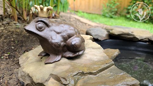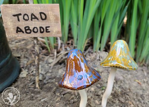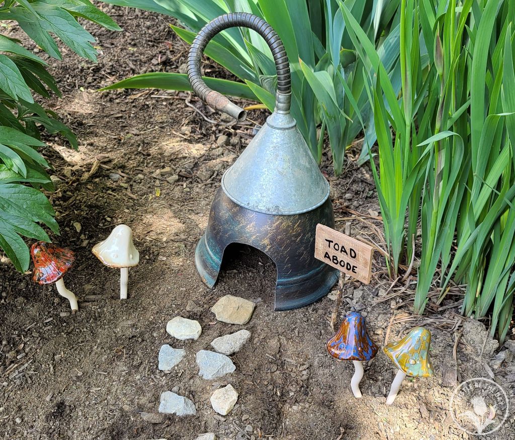 To complete the toad habitat, I chose to add some whimsical elements such as ceramic mushrooms and a handmade “Toad Abode” sign. I also added solar lanterns that will attract flying insects at night, offering the toads plenty of options on which to dine. Adding mulch to keep the ground moist and to help suppress weeds will also be beneficial. The finishing touch was to add my “prince charming” statue. He makes me smile as I imagine him waiting for his princess to come and offer him a kiss.