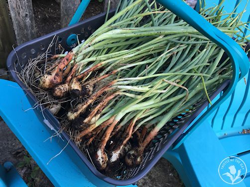 This year, I also decided to try my hand at growing garlic’s close relative, the shallot. I honestly don’t think I had ever tasted shallots before deciding to try growing them in my garden. All I knew was that their flavor resembled a cross between garlic and onions, which was good enough for me. After all, one of the best parts of having a garden is that you can experiment with growing new plants. I went with the variety ‘Dutch Red’ and wasn’t disappointed. I planted the shallots and garlic in the fall simultaneously, and they delighted me by also popping up in early spring. The flavor of these shallots is so delicious that I think they have earned the right to be on the “must grow” list right alongside my garlic. I will try to have the willpower to save enough to plant in the fall instead of eating them all in favorite recipes. It will be a difficult task.