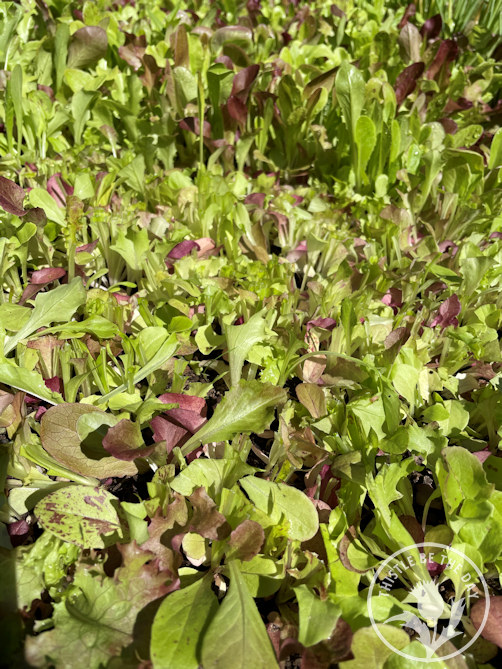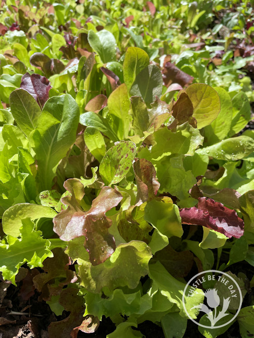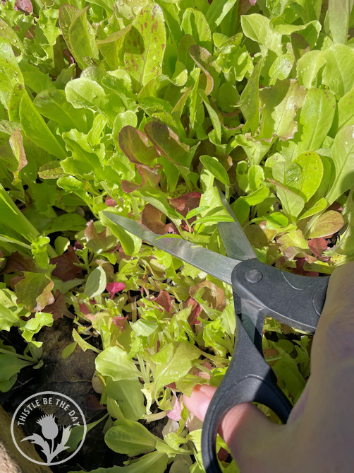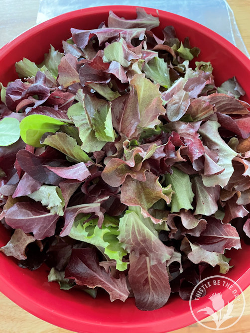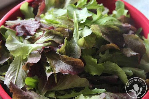 In my gardens, I typically grow spring mixes instead of heads of lettuce. I love the versatility of the cut-and-come-again mixes. They allow you to harvest as much as you need, and they regrow several times in a season. One packet of seeds will provide bowl after bowl of delicious greens. Of course, I inevitably plant way too much every year, dazzled by the endless available varieties that I MUST try. I wind up harvesting so much that we eat like rabbits for weeks on end so that it doesn’t go to waste. If it didn’t wilt, you would probably find me smuggling it under my jacket and leaving it anonymously on all the neighbor’s doorsteps, just as the zucchini gardeners do with their harvests. Except my neighbors would say, “Lock your doors, it’s lettuce season!”