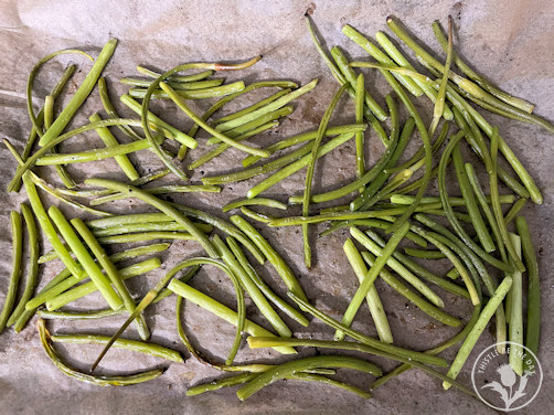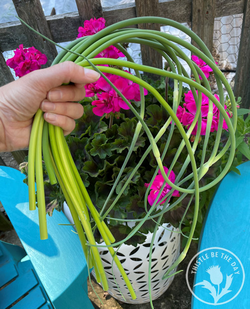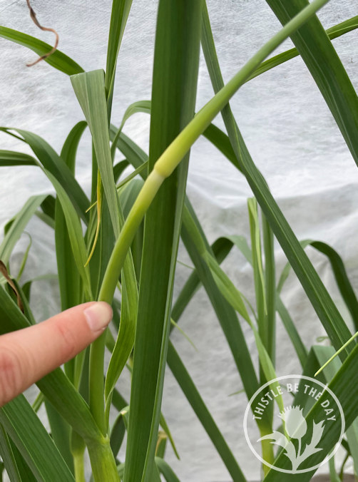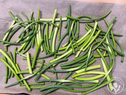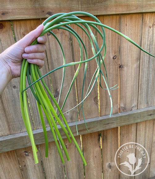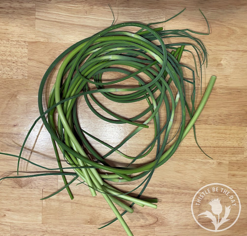 Harvesting scapes from the hardneck garlic in your garden is straightforward. For years, I would cut the scape off at the point where it was emerging from the stalk once it was the desired size, which worked beautifully. However, recently, I was given a new tip for harvesting them and decided to give it a try this season. Instead of cutting the scapes off at the top of the stalk, you gently pull them up through the plant stem. It took some finesse and a few tries, but I finally got the hang of it. This method gives you scapes twice the length, which means more pesto, yay! Once harvested, scapes will last for several weeks in the crisper drawer of your refrigerator, or they can be processed into pesto and frozen for later use.
