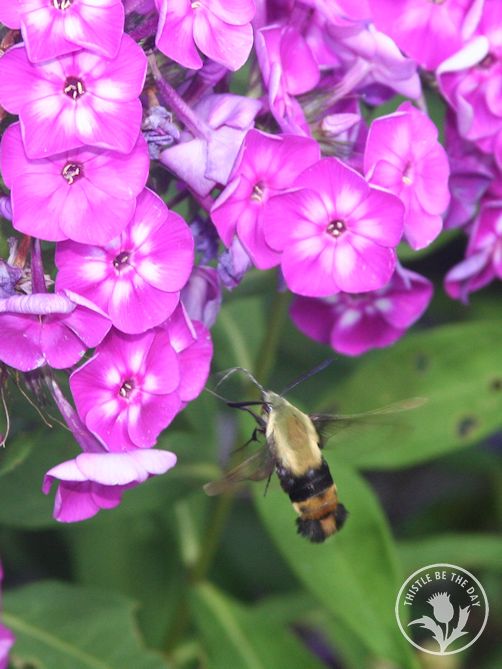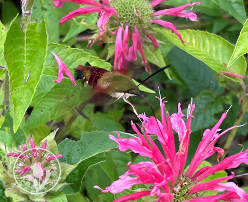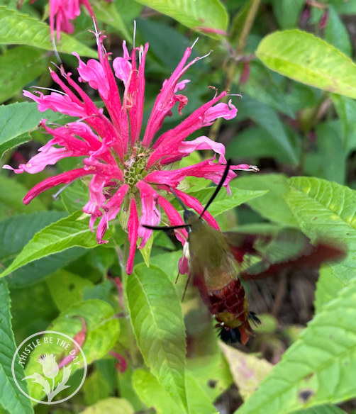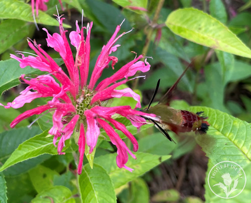 One of my favorite activities in the garden is picking flowers, arranging them, and bringing them indoors to enjoy. Immersed in flowers, gathering the components for my bouquet, I transport into the world of the pollinator. As a result, I can get up close and personal with these amazing creatures as they flit from bloom to bloom, carrying out one of nature’s most essential tasks. They are fascinating to watch, and as a gardener, I consider it both a privilege and a responsibility to provide them with ample habitat to thrive. Recently, while among a patch of bee balm (Monarda), I had an exciting pollinator sighting that I will not soon forget. Zooming to and fro with the acrobatics of an Olympic gymnast was a hummingbird clearwing moth.