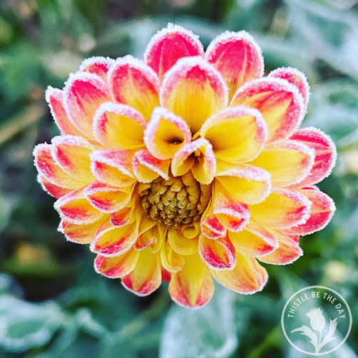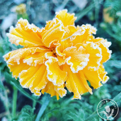 On November 4th, our first hard frost blanketed the landscape, leaving a dazzling display of ice crystals shimmering in the morning sun. As beautiful as it was, I knew with a sinking feeling in my heart that this marked the end of the blooming beauties in the garden. Nevertheless, I was able to capture a few photos of these blooms, cloaked in sparkles, as if in the final act of a Broadway show before the curtains draw to a close. How gorgeous they looked before turning to a brown mush later in the day when they thawed. I couldn’t complain, however, as the first frost was much later than in years past, and I enjoyed an extra month of flowers in the garden.