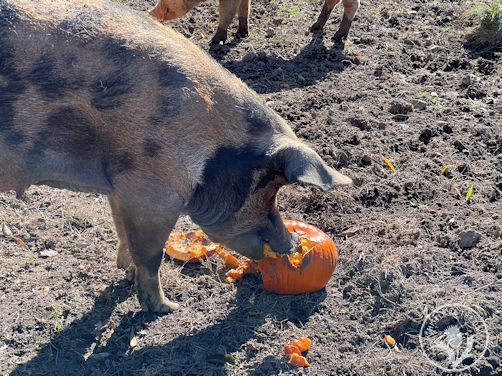 We took our annual trip to Catskill Animal Sanctuary to feed our pumpkins to the pigs during the first week of November. It has become a fall tradition in our household to donate our pumpkins to the sanctuary, where the rescued pigs excitedly devour them. Our leftover carved Halloween creations, as well as the pumpkins we grew in the garden this season, were all hauled to the sanctuary for the pig’s enjoyment. It is so satisfying (and comical) to watch a pumpkin that you grew become a delectable treat for a pig! I’ll take that over putting them on the compost pile any day!