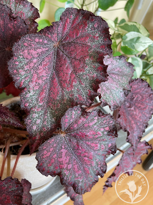 - Rex Begonia (Begonia rex-cultorum): I have lovingly grown begonias for many years, but this particular plant is my all-time favorite. I wish I knew the cultivar name, but sadly the tag simply said ‘Rex Begonia. If anyone knows the variety, please let me know. The speckled leaves in beautiful shades of pink and maroon are captivating.