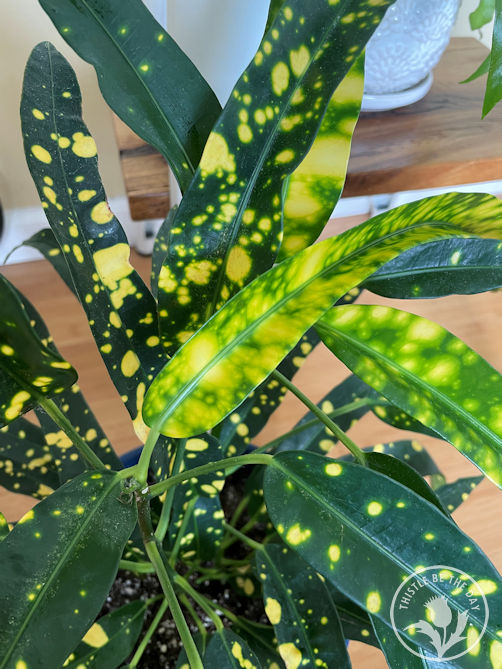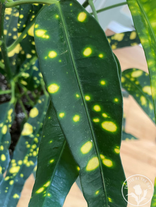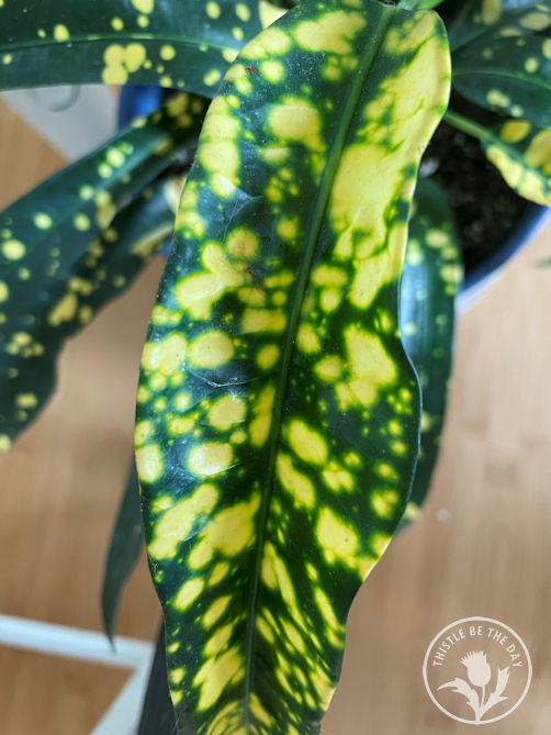 - Croton’ Gold Dust’ (Codiaeum variegatum): This plant is stunning. The leaves each have a unique splattering of bright yellow spots that give the plant a cheerful vibe. The leaves look like they’re coated in paint splatter, something I’m drawn to as an artist. The fact that each leaf has a unique pattern makes it all the more exciting. This beauty easily sailed into a top-five spot on my list.