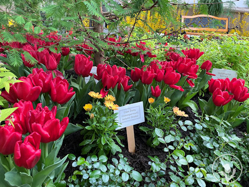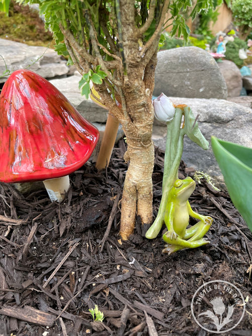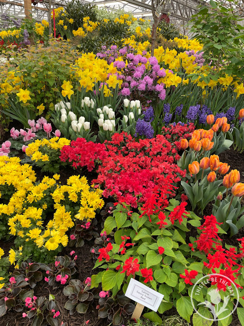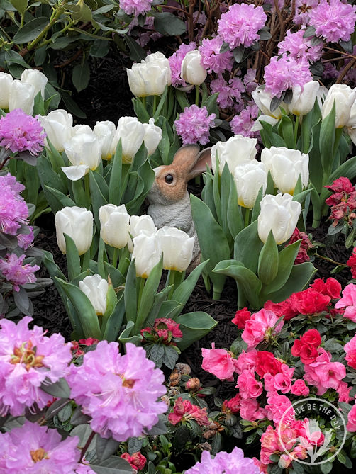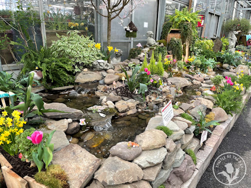 I was delighted by all the whimsical details throughout the show: birdhouses hanging among flowering branches, statues of woodland creatures hidden among blooms, and the witty placement of comical figurines. Each year, the landscape team creates a scavenger hunt with their figures for the children attending the show. In years past, you would find kids, scavenger list in hand, excitedly parading around the beds searching for creatures. Shouts of “I found it!” filled the air as they delightedly crossed the item off their list. Unfortunately, due to COVID, the scavenger hunt has spread throughout the store to discourage crowding in the greenhouse, but it is still a charming part of the show.