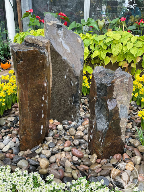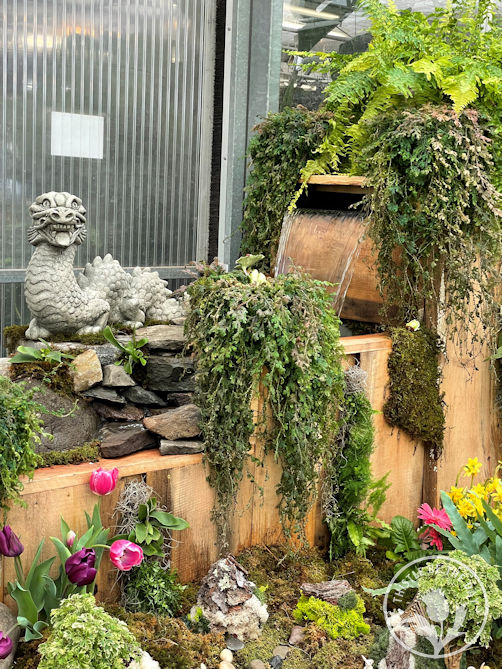 The Adams Landscape Team constructs the garden displays inside their 6,000 square foot greenhouses. The show provides work for the team in the winter months and runs for just one short week before being disassembled to make room for potted plants and seedlings. As I entered the greenhouse this year, I was immediately met by a prominent water feature that took center stage in the display. A bubbling stream ran from the top of a flower-laden hill down into a small pond. It was amazing and set the mood for the entire show. I can’t even begin to imagine the team’s work to construct this towering water feature.