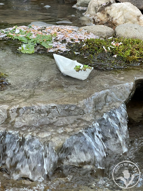 Around another corner, I discovered two additional water features. First, another babbling brook ran through a fairy village planted with ferns, hostas, and daffodils. Mini figurines of woodland creatures added to the feeling that you were a special guest stepping into a secret fairy world.
