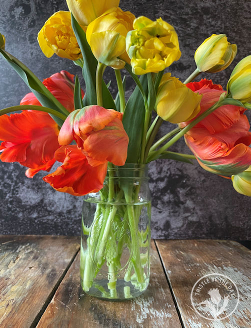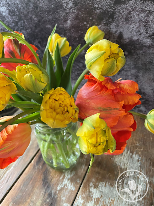 In the fall, I planted 300 tulip bulbs in the garden, and the beautiful blooms that are now making their appearance were well worth the effort. I have been picking bouquets daily, bringing some inside to enjoy, and gifting bouquets to others, hoping to brighten their day and bring a smile.