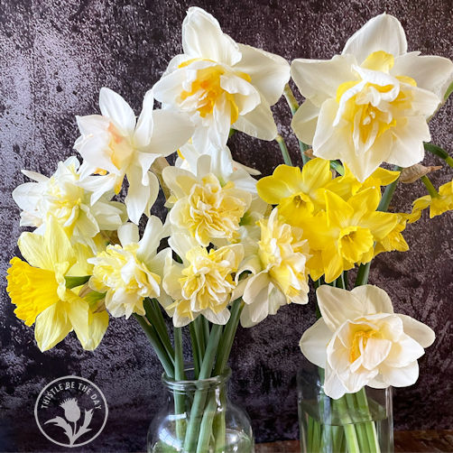 My garden beds have also sprung to life this month with a glorious display of daffodil and tulip blooms. These flowers are always so cheerful in their bright, happy colors, and I can’t help but pick handfuls of them to bring inside for enjoyment. The daffodils dot the landscape with their assortment of colors and shapes that are delightful. Again, I can’t help but smile when I see them.