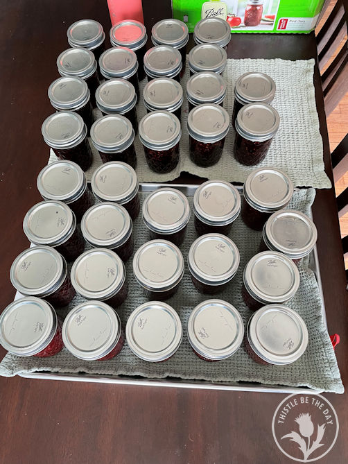 Also, in April, I spent a marathon day in the kitchen preserving some of last season’s berries into jam. Five hours, four batches, several burns, two sore feet, and a jam-stained apron later, I had 36 blackberry and raspberry jam jars. Canning jam was part of my mission to empty the freezer in preparation for this year’s harvests. It’s hard to believe that I will be filling our freezer with fresh berries once again in a few short months.