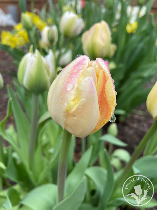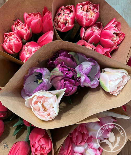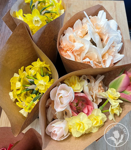 Sadly, the beginning of May marked the end of the tulips and daffodils. They were extraordinary this season, and I was sad to see them go. I thoroughly enjoyed learning how to grow and harvest these garden beauties and have plans to plant many more for next season. As a last hurrah, I decided to make and give away twelve tulip and daffodil bunches to our neighbors for Mother’s Day. Gifting bouquets is something I hope to do often this season as part of The Growing Kindness Project, which aims to cultivate kindness and connection within communities by growing and giving flowers. It also allows me to practice my bouquet-making and packaging skills and get valuable feedback from recipients, which will help me as I work to grow a business. I placed the free bouquets in my driveway, and they were gone within the hour, all in the hands of neighborhood mothers.