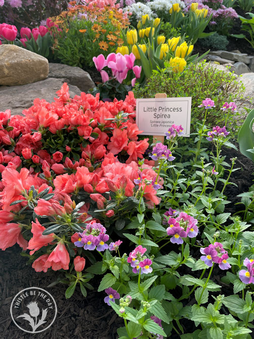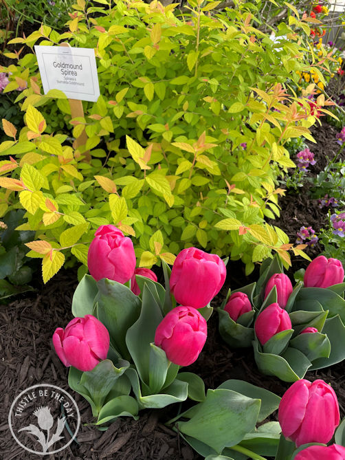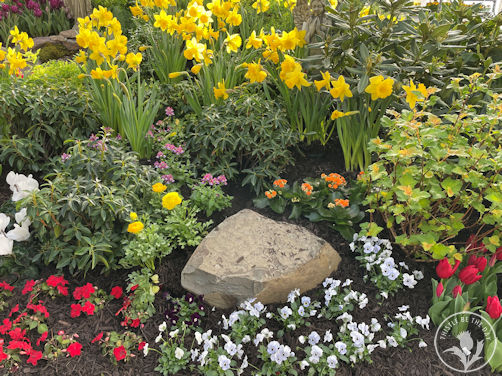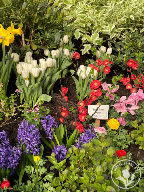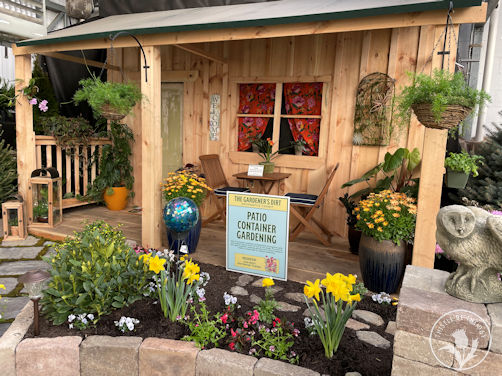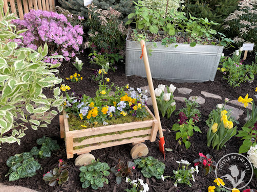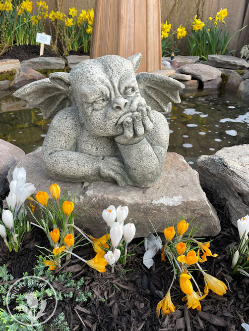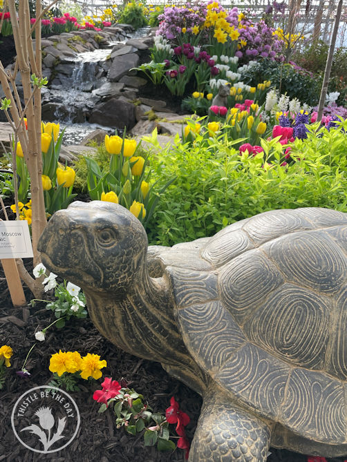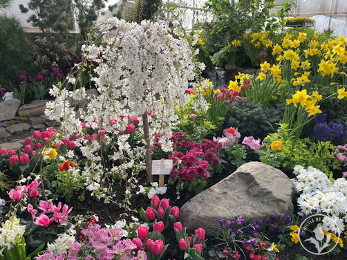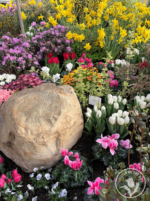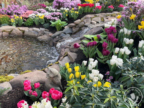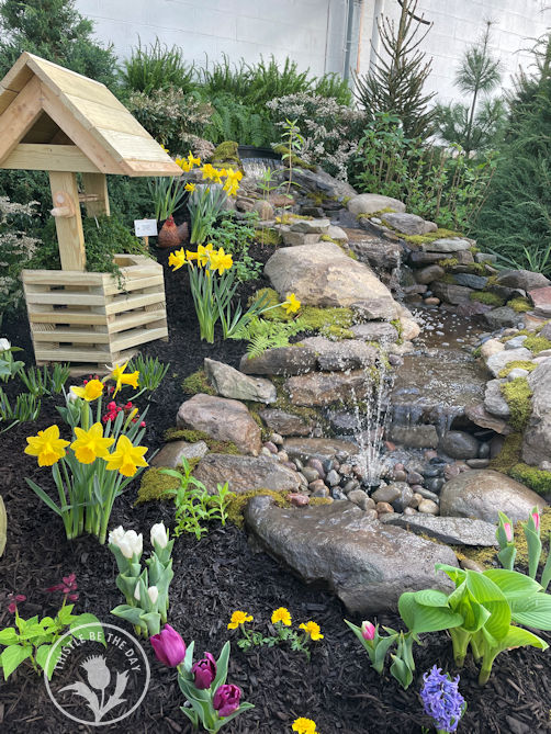 Once again, this year didn’t disappoint! With its four water features, gorgeous spring blooms, patios, and potting shed display, it had something for everyone. The prominent feature was the main waterfall as you entered the exhibit, surrounded by beautiful plantings of tulips, daffodils, and flowering shrubs. The sounds of the bubbling water and the smell of lilacs fill the air, and if you close your eyes, you are transported to spring.