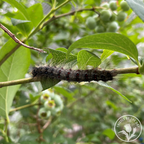 Spongy moth caterpillars prefer oak trees as their food source. However, they will eat the leaves of over 300 species of woody plants, and it turns out that our blueberry patch suits their dining needs. I was horrified to discover hundreds of Spongy moth caterpillars taking up residence on our bushes, using them as an all-you-can-eat buffet! Blueberries are my favorite edible to grow (sorry, tomatoes and peppers, you’re a close second), so when I discovered they were causing severe damage to our bushes, I declared an all-out war against these alien invaders. Also, I had sold out of our Berries & Blooms CSA subscriptions, and I didn’t want to disappoint our members by not having berries to go with their blooms!