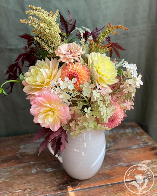 Here it is, October, and fall has fully embraced the farm. I am so ready for my favorite season to begin. I am a sweater-weather girl through and through. I love the smell of freshly fallen leaves and how they crunch under your feet, the nip in the air, and nature’s beautiful fall color palette. I adore apples, pumpkins, gourds, fall flowers, and the smell of pumpkin spice filling our home from freshly baked fall confections. Fall also brings a slower pace and change in focus on the farm, which is welcomed. It is time to start preparing our beds for fall plantings, all while soaking in the last floral gifts from the garden.