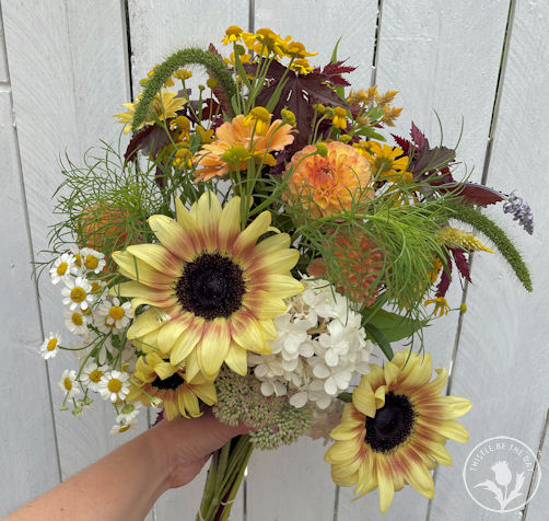 As the growing season winds down, the flowers evoke autumn vibes in their orange, yellow, and burgundy shades. The last of our sunflowers in September were a sight to behold, and their cheery faces were a delightful contrast to the changing season. We enjoyed treating our CSA members to fluffy-petaled and bi-colored varieties. Our CSA season wrapped up in September, and it was bittersweet. I thoroughly enjoyed visiting with our CSA members, getting to know them, and sharing stories and flowers each week during our growing season.
