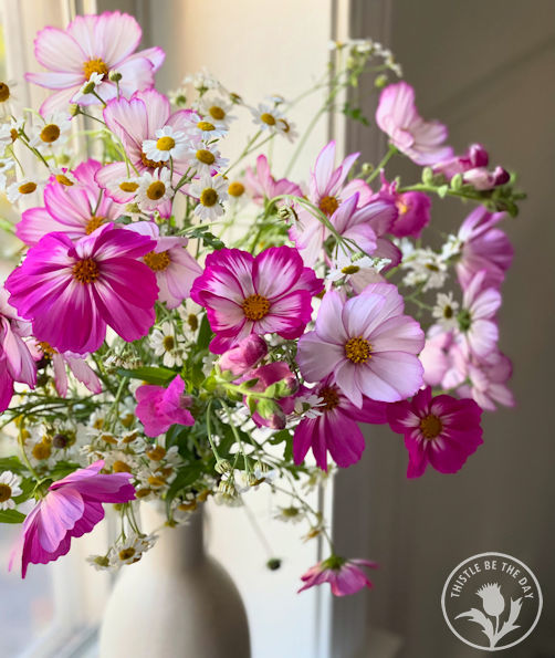 Our cosmos, resilient as ever, held on late into October, a reminder of summer well into fall. The bright and cheery pink blooms of Candystripe cosmos, with their whimsical, light, airy nature, were a treat late into the fall, starkly contrasting the typical muted color palette. These late bloomers, with their vibrant hues, not only took our breath away but also filled us with a sense of inspiration and joy. And the pollinators, always a welcome sight, enjoyed them just as much as we did!