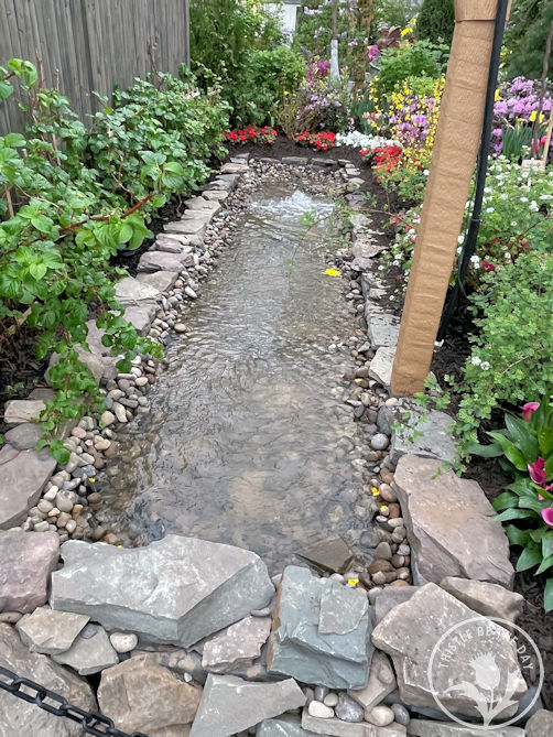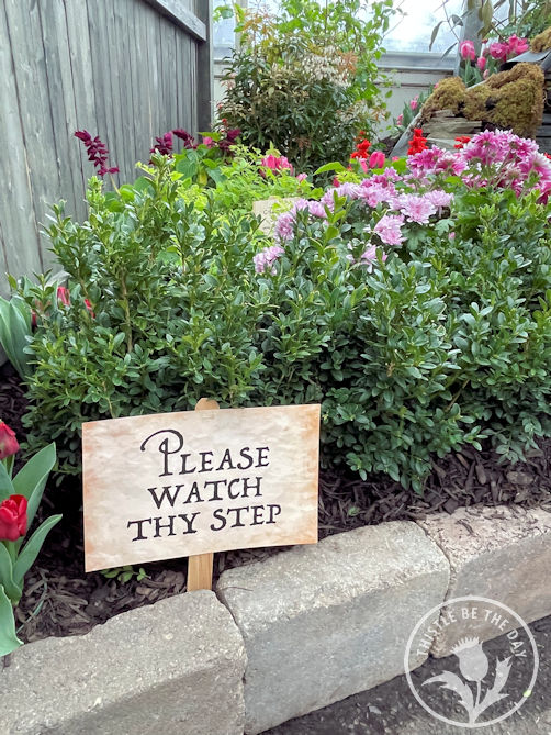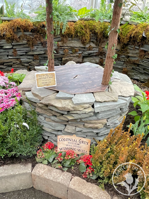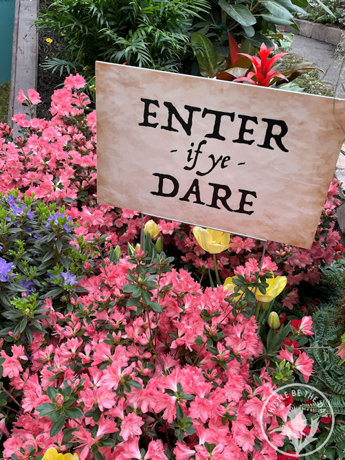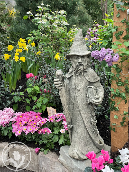 The curved walking path meandered through the displays and took you on what felt like a stroll through a magical fairy forest. Around each corner lay surprises such as a waterfall, a flower-filled archway, an herb garden, a wishing well, or a whimsical statue or two. Comical signs posted throughout the show echoed the theme and gave me a chuckle.