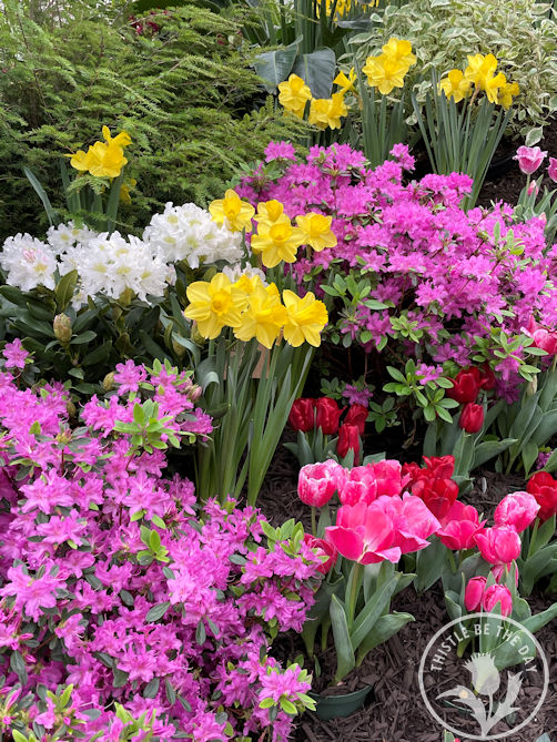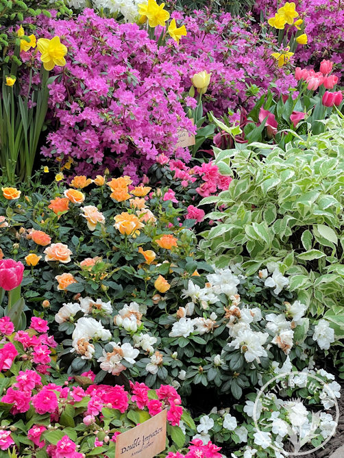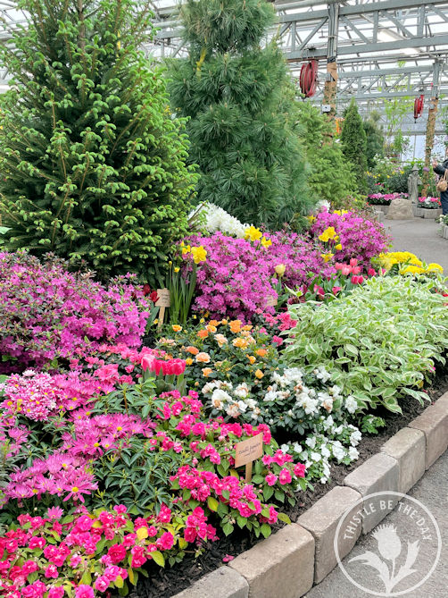 Besides the lilacs and other flowering shrubs, tulips, daffodils, azaleas, chrysanthemums, calla lilies, impatiens, pansies, and even roses were the predominant blooms throughout the show. I loved the bright pink, yellow, purple, and orange pops of color interweaved among tropical plants, variegated shrubs, and saplings. After a long, grey winter, seeing these colors brought joy to my soul!