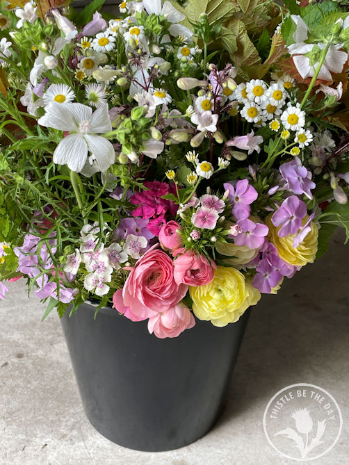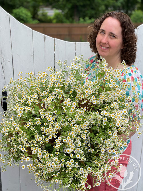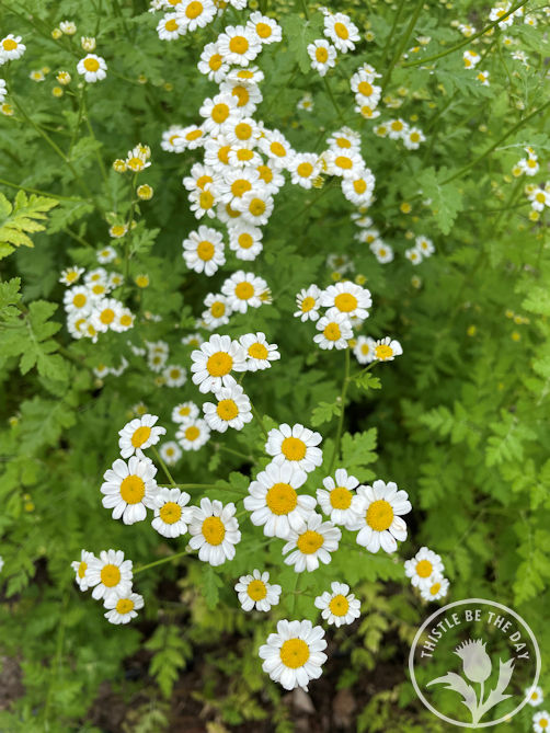 It’s been a while since I’ve put a plant in the spotlight, and I was reminded of that this week while I was admiring our feverfew during harvesting. The feverfew is blooming profusely on the farm right now, and I have become quite smitten with these dainty, whimsical flowers. So, I’m featuring these beautiful blooms in our blog post today, because I decided that Thistle Be the Day they get their moment in the spotlight!