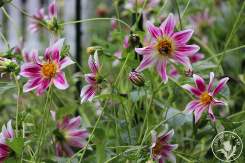The dahlias remained dazzling in late September and October, as they really shine during fall’s cooler temperatures. When other blooms in the garden start to fade, dahlias are in their finest moments.  Despite several light frosts in October, our dahlias were still blooming and feeding the whistling bees.