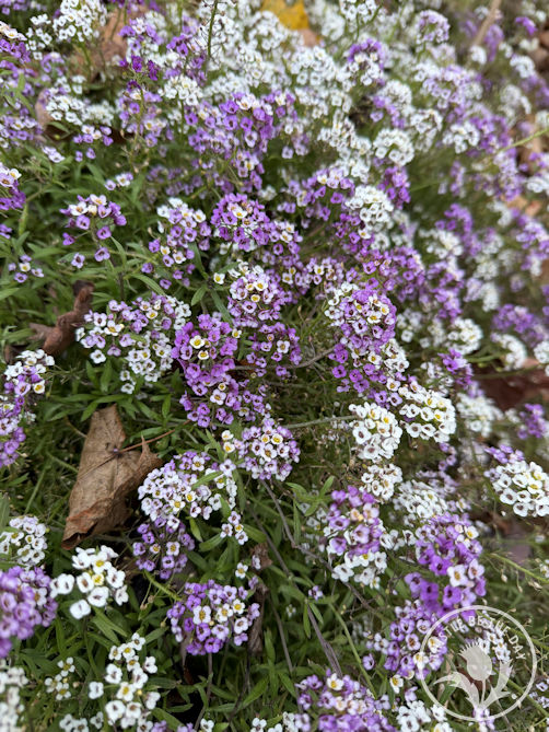 By November, all the blooms had faded in the garden except the hardy sweet alyssum, which provides late-season nectar for the pollinators when all the other flowers are gone. We use these lovely plants as “living mulch” in our beds underneath our cut flowers. They help suppress weeds, retain moisture at the roots of our flowers, and help keep our soil in place. Best of all, they feed pollinators all season long. Alyssum comes in a beautiful array of colors, and I always enjoy the sweet fragrance and tiny florets that dot our flower beds every season.